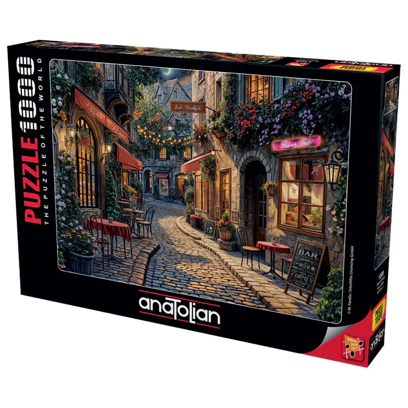 Lively street bars glow with colourful lights and nightlife energy in this vibrant 1000-piece jigsaw puzzle. Festive atmosphere invites fun city exploration. A premium puzzle that brings exciting urban nightlife vibes indoors.