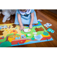 Each animal in this giant farm puzzle has a tactile piece to develop a childs tactile senses. Feel the chickens feathers, pat the bunny's fluffy tummy! The colourful, high gloss images are printed onto durable 2.5mm card-stock. Puzzle pieces are chunky and over-sized and come nicely packaged in a re-usable storage box, making a delightful pre-school age children's gift. Features 8 farm animals. Dimensions 70x50cm.