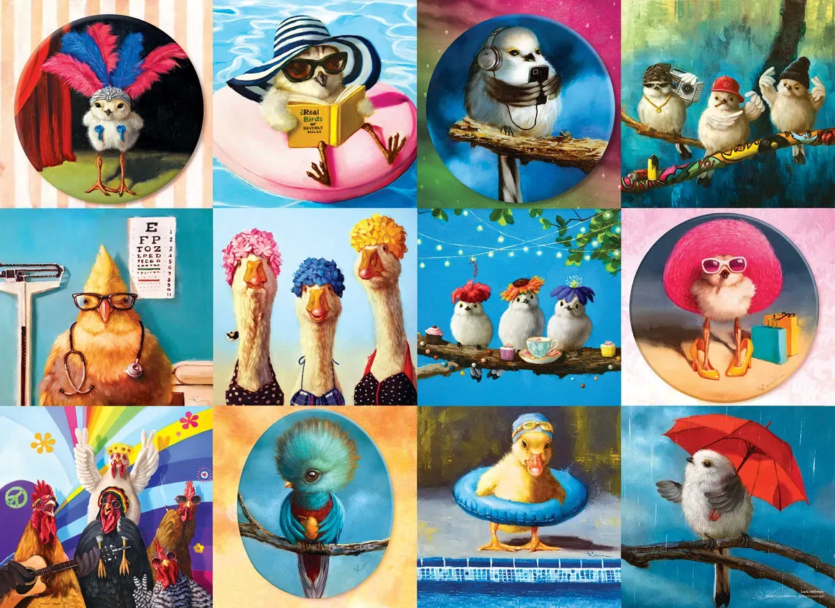 A collage of artist Lucia Heffernan's humorous bird images, including "Birdz in da Hood," "Featherologist," "Golden Age," and other popular titles.