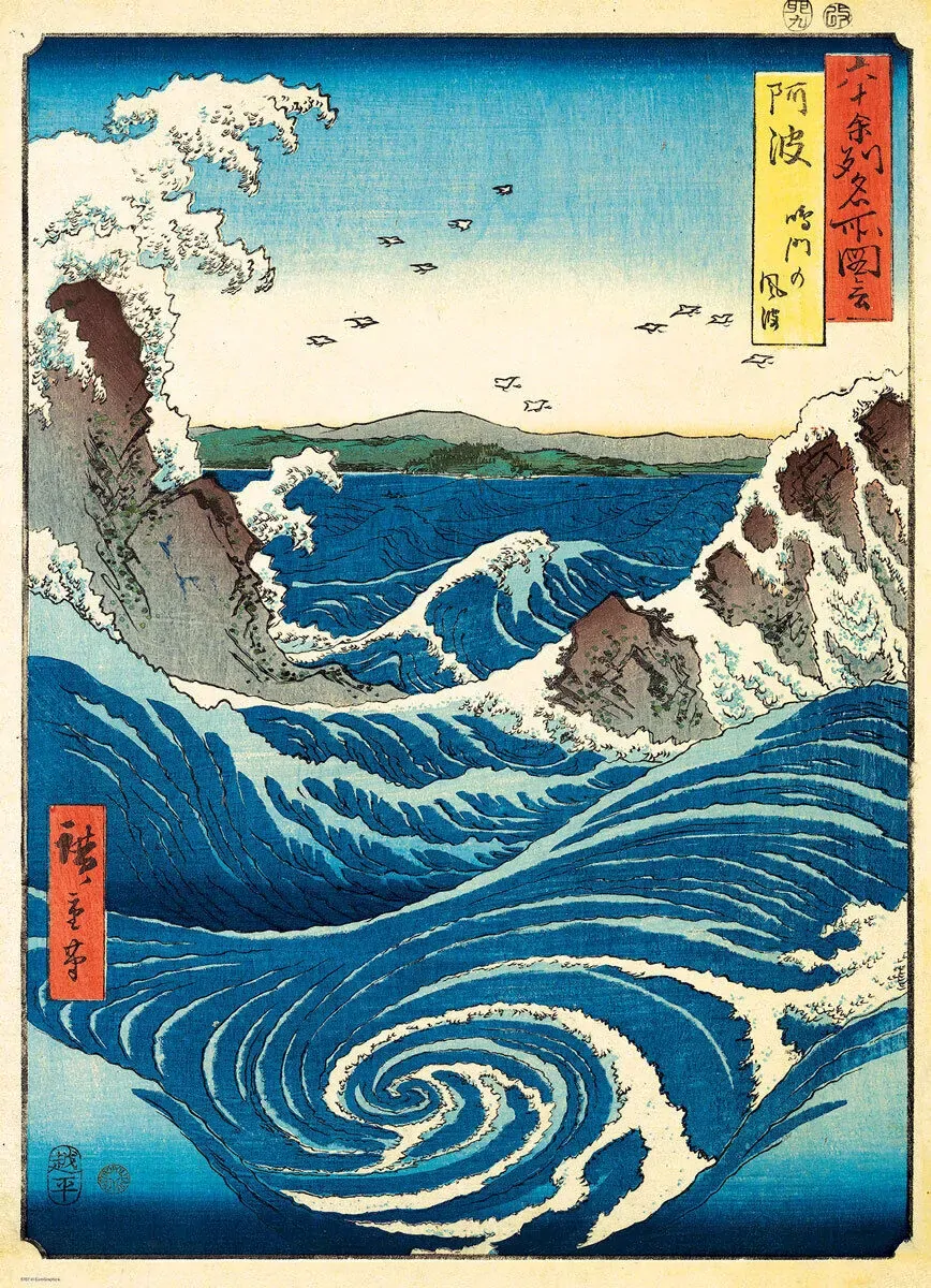 This striking print depicts one of Japan's tidal whirlpools in the Naruto Strait. The strait's tides produce the fourth-fastest current in the world, shifting enormous amounts of water in and out of the 1.3km passage everyday. Painting by Japanese artist Utagawa Hiroshige.