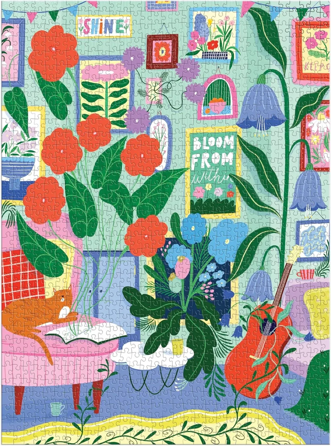 Step into a cozy living room bursting with life in the Room to Bloom 1000 Piece Puzzle from Galison. This charming scene features houseplants thriving everywhereeven growing out of a vintage guitarcreating a whimsical, lush indoor jungle thats full of personality and warmth. Every piece you fit together brings you closer to this vibrant, green-filled sanctuary.