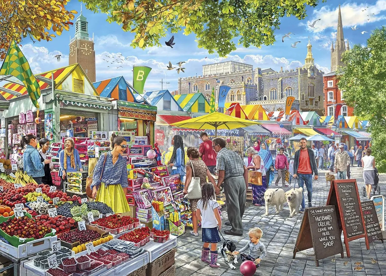 This 1000 piece puzzle depicts Norwich Market, an outdoor market consisting of around 200stalls in central Norwich, England. Founded in the latter part of the 11thcentury to supply Norman merchants and settlers moving to the area following the Norman conquest of England, it has been in operation on the present site for over 900years. Steve Crisp has captured the hubbub of the market stalls today, with the famous Norwich Castle standing proudly in the background.