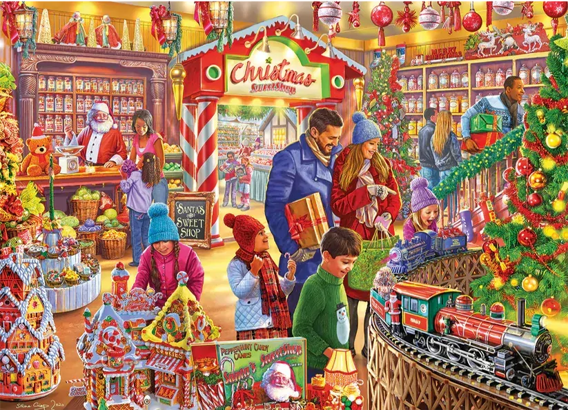 Visit Santas Sweetshop for some delicious seasonal sweeties in this beautiful 1000 piece festive jigsaw puzzle by Steve Crisp. The kids are beside themselves with joy as they browse the treats in Santas Sweetshop.