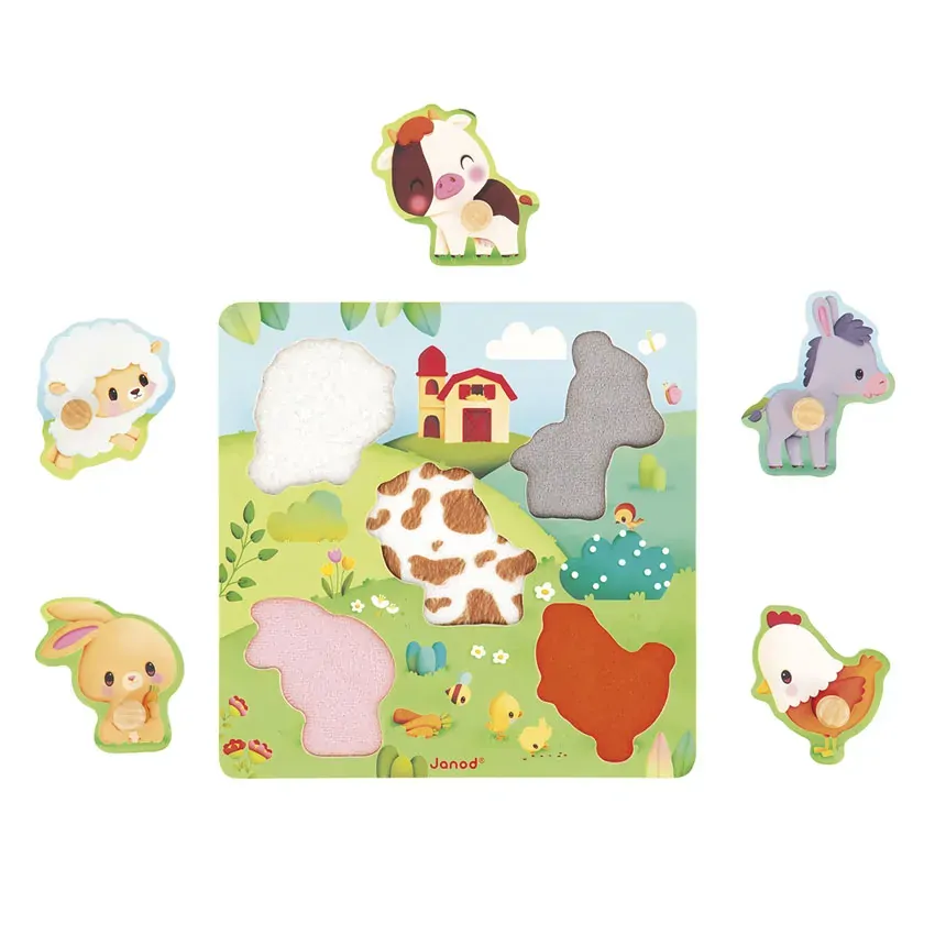 Introduce your toddler to farm animals with this delightful tactile wooden puzzle. Featuring five animal pieces with easy-to-grip pegs, it encourages exploration and sensory play. Each piece reveals a textured surprise beneath, mimicking the animal's coat to develop your child's sense of touch, dexterity, and problem-solving skills.