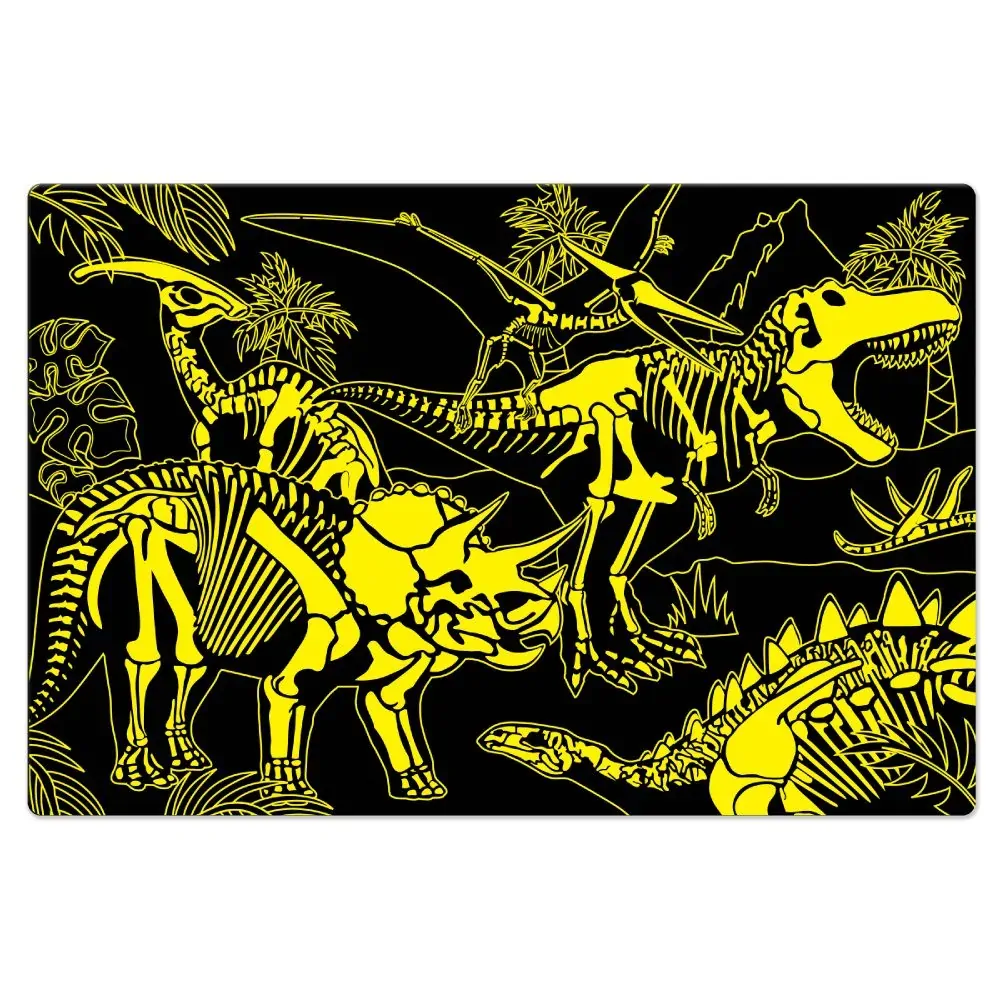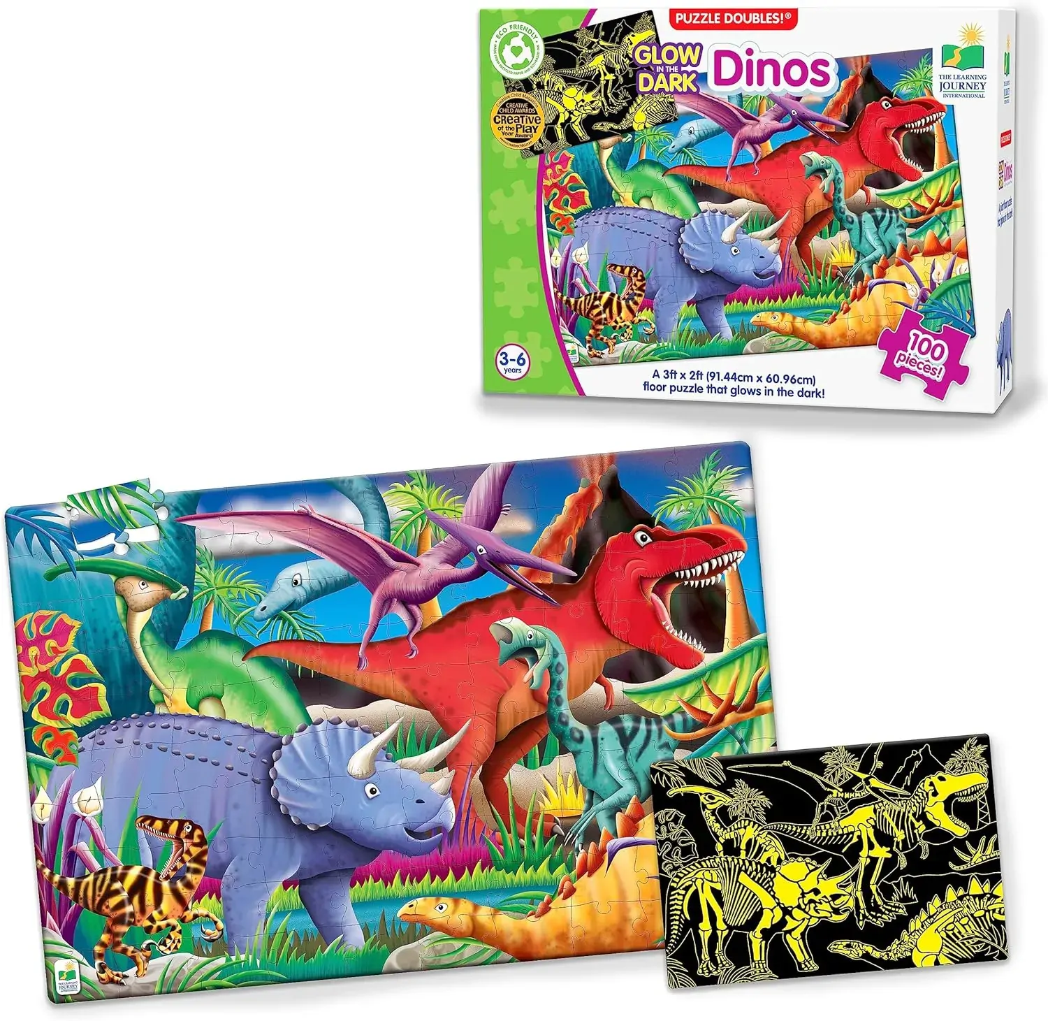With Puzzle Doubles! Glow in the Dark - Dinos puzzle, learning about these extinct animals has never been so much fun! After assembling this 100-piece puzzle, turn off the lights and watch it glow in the dark! Puzzle Doubles! Glow in the Dark! puzzles are a fun way to expand your knowledge of different environments. Your child will be amazed by the lively illustrations and prehistoric skeletons!