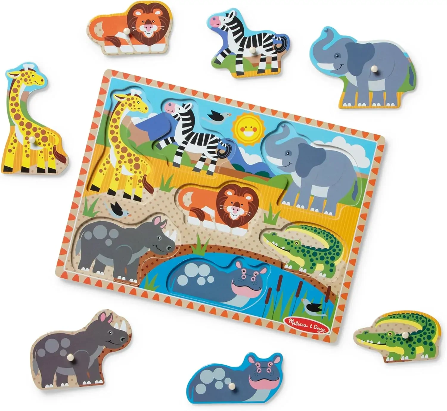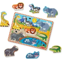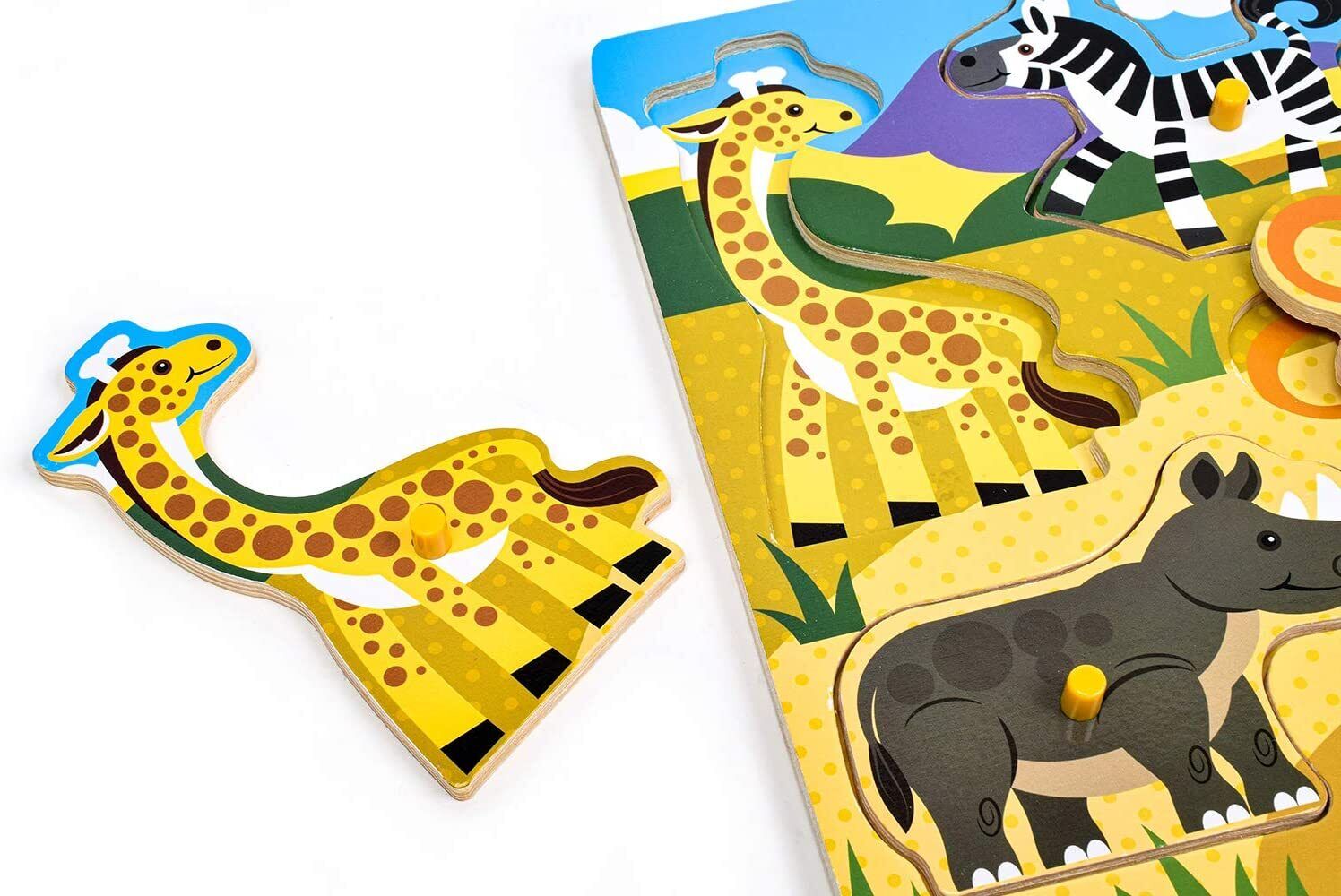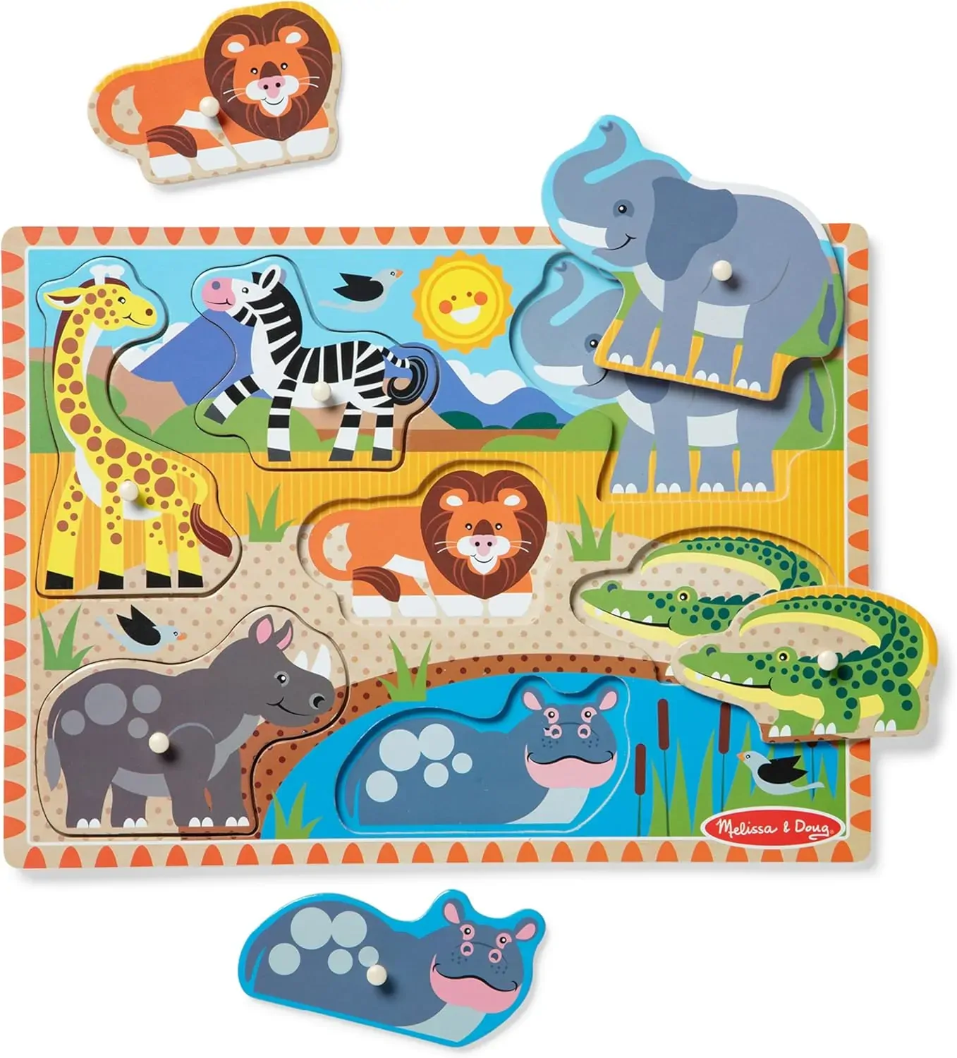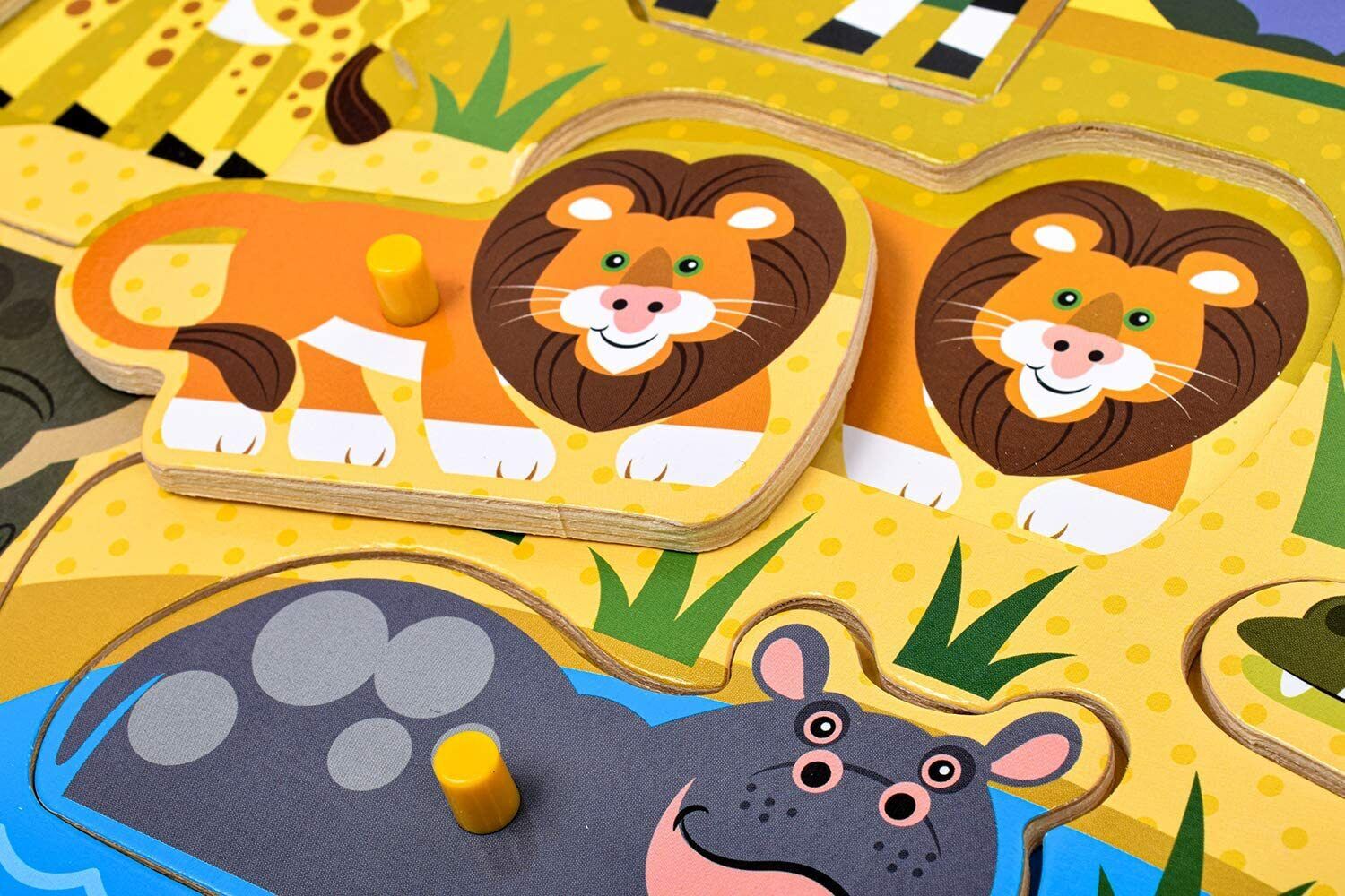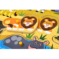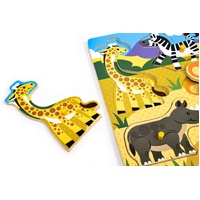 Your child will "go wild" matching the baby animals to their parents in this sturdy wooden puzzle. Easy-grasp pegs and pictures under the pieces will help your child solve this simple 7-piece puzzle. Good for memory, fine motor and hand-eye skills practice.