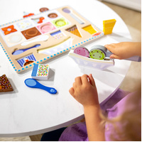 For puzzle play, match the pieces to pictures on the sturdy wooden puzzle board. For pretend play, lift and arrange pieces with the magnetic scooper to create ice cream treats!