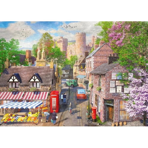 Step into a world of medieval charm with this 1000-piece jigsaw puzzle featuring Castle Lane. This beautifully illustrated puzzle captures the essence of a quaint street leading up to a majestic castle, surrounded by a bustling array of shops. The scene is rich with details. Among the charming shops, you'll find a cozy antique shop filled with treasures from the past with a bright red letter box standing proudly. The intricate artwork and vivid colours provide the perfect balance of challenge and relaxation, offering puzzlers of all ages a delightful and rewarding experience.