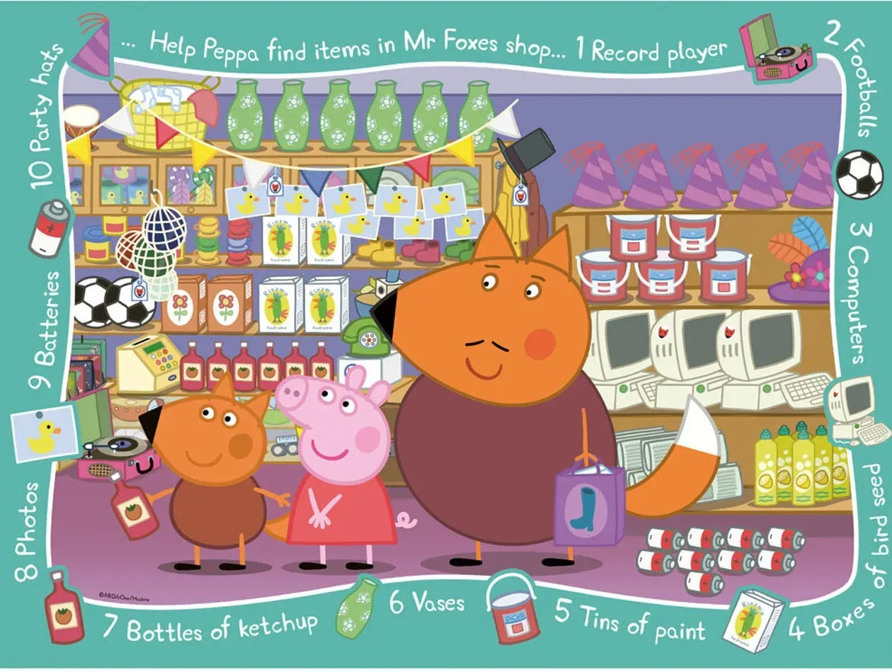A 16 piece Look and Find jigsaw puzzle featuring Peppa Pig, Freddy Fox and Mr. Fox as they explore what Mr. Fox's shop has to offer!