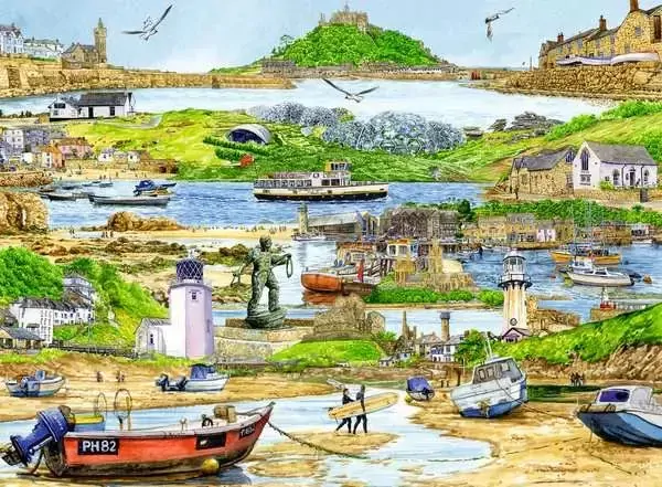 Cornwall is a favourite holiday destination in the UK, somewhere to relax, unwind and enjoy the beautiful landscapes. This puzzle captures some of Cornwalls most evocative and popular places, from top right they are - Porthleven Harbour, St. Michaels Mount, Mousehole; First and Last cottage at Land's End, Eden Project, Bodmin Moor Stones; St. Ives Harbour, Helford River Ferry, Boscastle; Perranporth, Falmouth Quay, Padstow Harbour; Polperro, Lizard Lighthouse Statue at Newlyn, Castle at Launceston, Truro Cathedral, Mill near Longships Lighthouse, St Ives Harbour Lighthouse, Minack Theatre, Newlyn Harbour; Bude