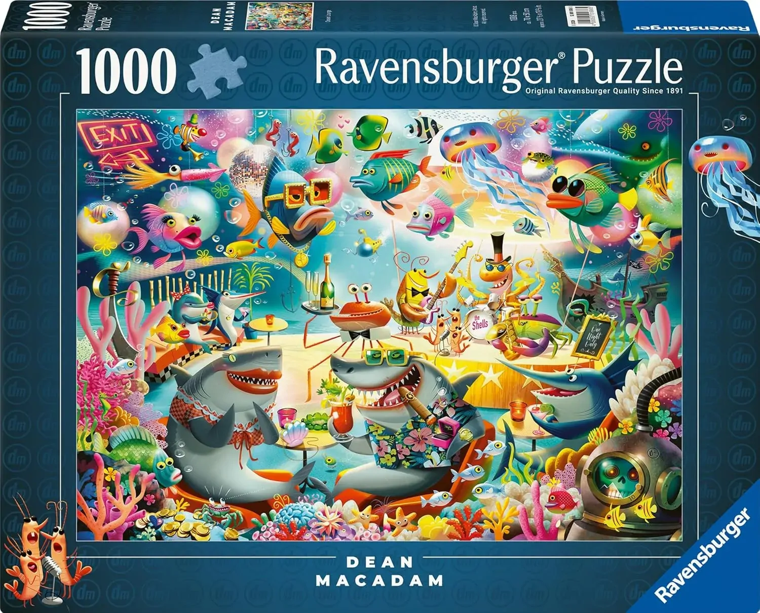 Sit back and enjoy the sounds of the Shells band in our brightly fun Ocean Lounge1000 piece jigsaw puzzle by Dean MacAdam. The cigar-chomping shark is in for a nasty surprise when he realizes the engagement ring for his sweetheart is missing. Do you think hell notice the sticky-fingered blue crab? That could put a damper on the fun. The deep-sea diver agrees, or would if he could.