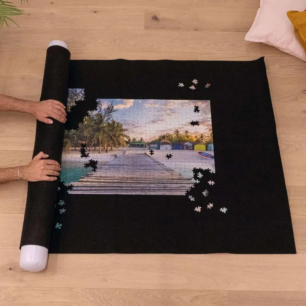 Our Roll Your Puzzle mat provides a work surface for puzzles of 1000 to 3,000 pieces. The puzzle is constructed directly onto the non-slip felt mat. For storage, simply inflate the plastic tube, wrap the puzzle around it and secure with the rubber bands provided. The puzzle can then be easily stored using a minimum of space.