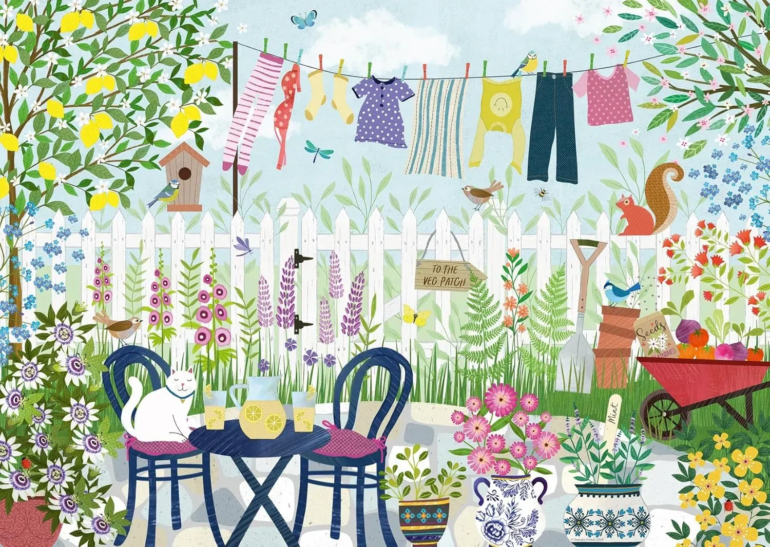 Bring the joy of a sunny summer garden into your home with this Ravensburger 1000 piece jigsaw puzzle. The charming scene by Georgia Breeze features a cosy table and chairs where a curious cat is perched, surrounded by vibrant, colourful flowers. A line of washing flutters gently in the breeze, a wheelbarrow overflowing with fresh vegetables adds rustic charm, and a playful squirrel sits atop a white picket fence while birds and insects bring the garden to life. With 1000 precisely cut Ravensburger pieces, this puzzle offers a satisfying challenge and a delightful finished image full of warmth, colour, and whimsical detail.