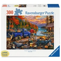 Relax and unwind with the Ravensburger Sunset Lake 300-piece Large Format jigsaw puzzle. Designed with larger pieces for easy handling, this puzzle is perfect for a peaceful evening of stress-free puzzling. The beautiful scene features a father and son camping by a quiet lake, surrounded by vibrant autumn colours glowing under a stunning purple and orange sunset. Watch as the boy skips rocks across the water, a seaplane glides overhead, and woodland creatures, including a buck, rabbits, and a cheeky raccoon quietly look on. With Ravensburgers premium quality and precision-cut pieces, this puzzle is a joy to assemble and an ideal choice for anyone who loves relaxing, nature-themed puzzles.