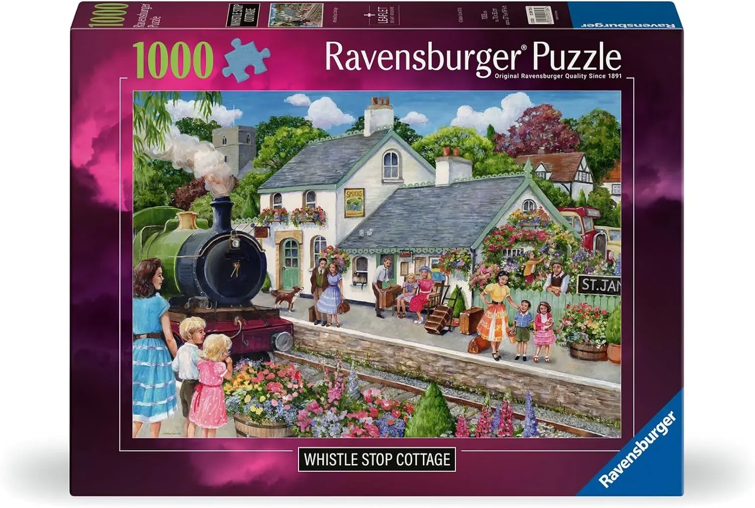 Step into a picturesque moment with Ravensburgers beautifully crafted 1000-piece jigsaw puzzle, Whistle Stop Cottage, featuring the enchanting artwork of Debbie Cook. This delightful scene captures a pretty station cottage in full bloom, surrounded by a riot of colourful flowers that create a warm and inviting atmosphere. Families and travellers, both adults and children, wait eagerly with suitcases in hand as anticipation fills the air. In the distance, a classic steam train approaches, adding a nostalgic touch of magic to this idyllic countryside setting. A perfect puzzle for anyone who loves a heartwarming journey back in time and the quality you expect from Ravensburger!