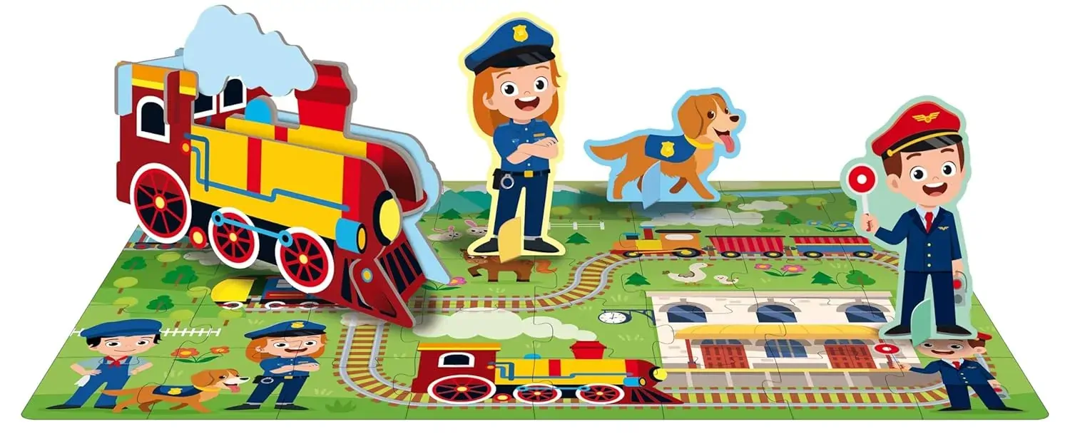 Railway stations are the scene of a continuous coming and going of people and trains. Find out who works there, the different types of trains, and more by flipping through the booklet, then have fun building the puzzle and miniature steam locomotive!