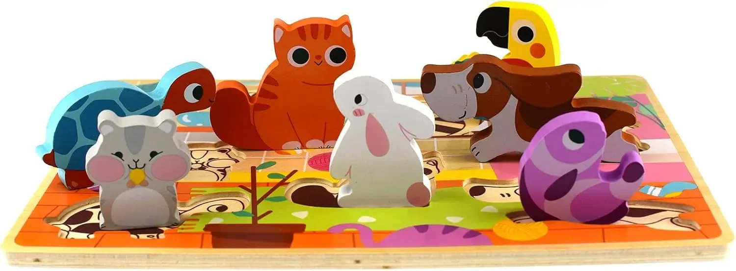 Challenge your little one with this bright and colourful chunky puzzle. featuring cute wooden animals, try and match the animal to the outline of the same animal in the board below. Once you've matched the animals, they'll nestle neatly into the base. When you've had enough of this challenging puzzle, each animal can be played with by itself. These pieces are sturdy enough to stand on their own for other role play or pretend play games.