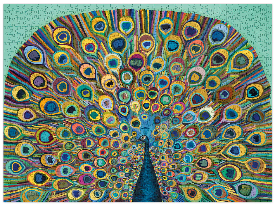 Experience the dazzling spectacle of the Peacock 1000-piece jigsaw puzzle by artist Eli Halpin. This breathtaking illustration is a vibrant masterpiece, capturing the full display of the peacock's tail feathers in a hypnotic pattern of jewel-toned "eyes."