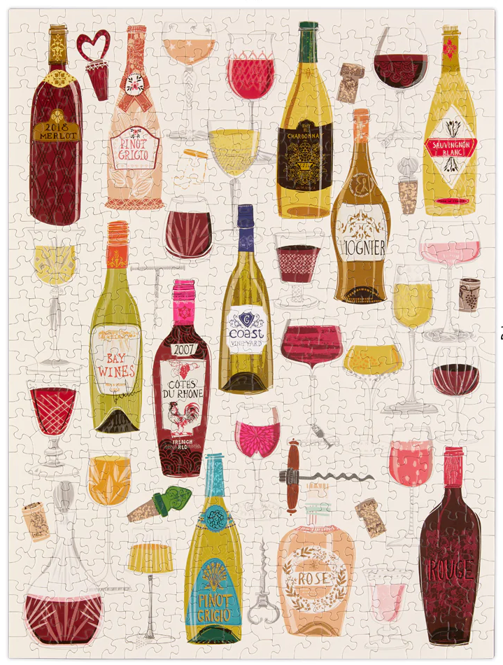 Whether a wine novice or connoisseur, one will love this 500-piece puzzle depicting an assortment of wine varietals, lovely stemware designs and shapes, along with a scattering of iconic bar essentials.